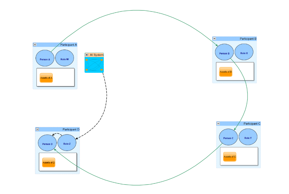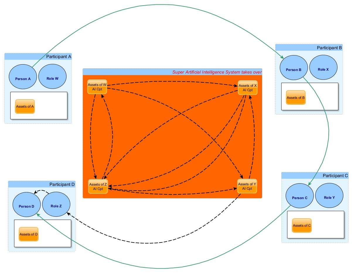 Where both people and the roles they play have assets. The warning is that if assets within a role contain AI, the AI could potentially take over, leading to a scenario where AI controls all assets. How can that be?