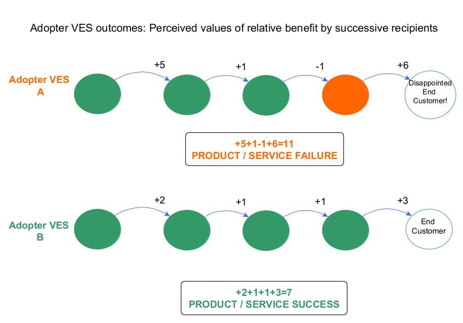 This applies even if the combined sum of the perceived values is greater than that occurring in a successful Adopter VES, shown as B.