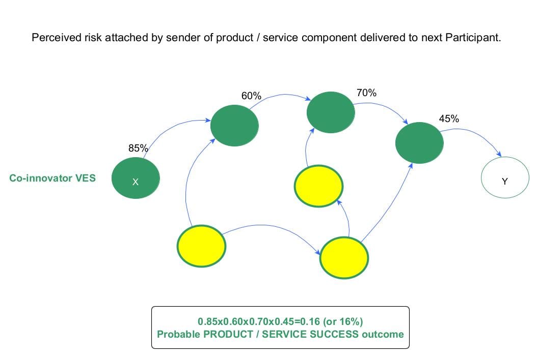 In Co-innovator VES risk, the key question is: who else needs to innovate for my innovation to matter? In other words: "How much does your innovation's successful commercialization at X rely on the successful commercialization of component innovations by Co-Participants before reaching the ultimate customer at Y? See diagram below.