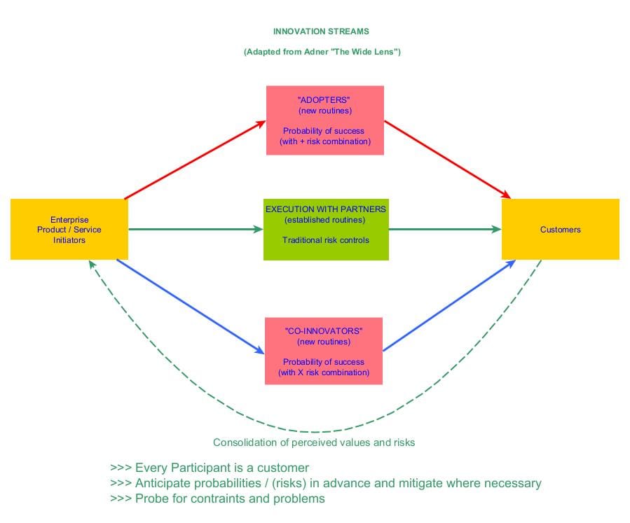 However, success is no longer solely tied to execution competencies within the enterprise following known routines, shown green in the magnets above and the diagram following. When new routines are required, it is also vital to consider interdependence between value network participants - channel partners and suppliers for example - shown red in the diagram. Mastering interdependence principles leads to significant gains, while neglecting them and the attendant risks results in inefficiencies, disappointments, and ultimate failure [2]. The majority of innovations that erroneously follow the green pathway fail if co-innovation is involved. Further, if the risks attendant to adoption are unrecognized, a similar unfortunate result is likely. This wider viewpoint requires strategists to develop a clearer view of the full set of dependencies rather than simply the immediate innovation environment using established routines.