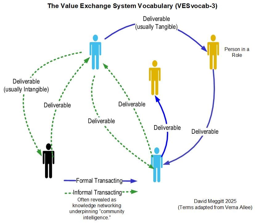 Deliverables are conveyed by Participants transacting formally or informally between themselves using a mechanism that in VES can range from an email to an oil tanker! Make a clear distinction in the diagram between the two types of transacting; formal or informal.
