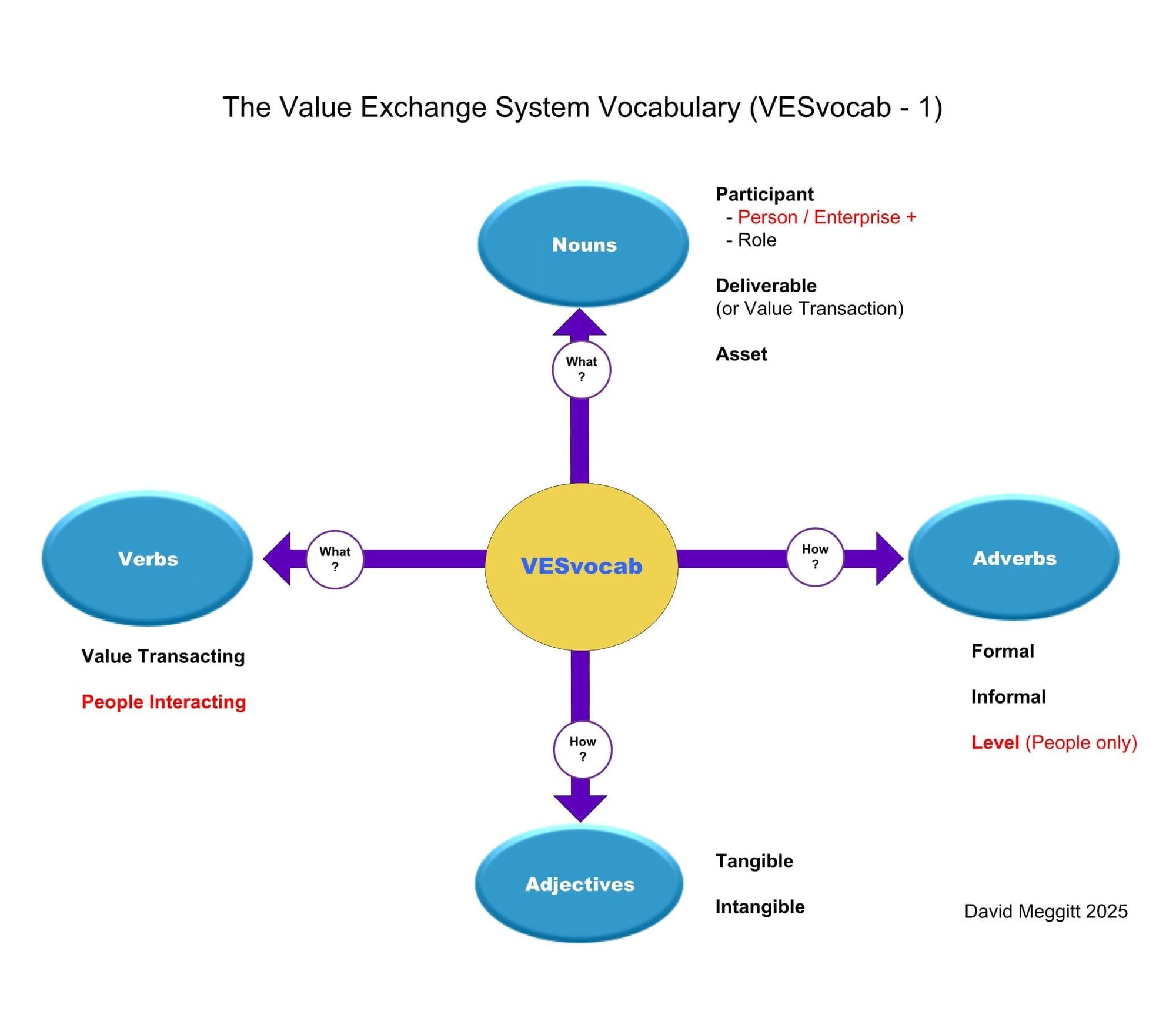 VES uses a short vocabulary, VESvocab, consisting of Nouns described by Adjectives or Type, and Verbs described by Adverbs - entities typically found in most languages. The basic list of words is shown in VESvocab - 1.